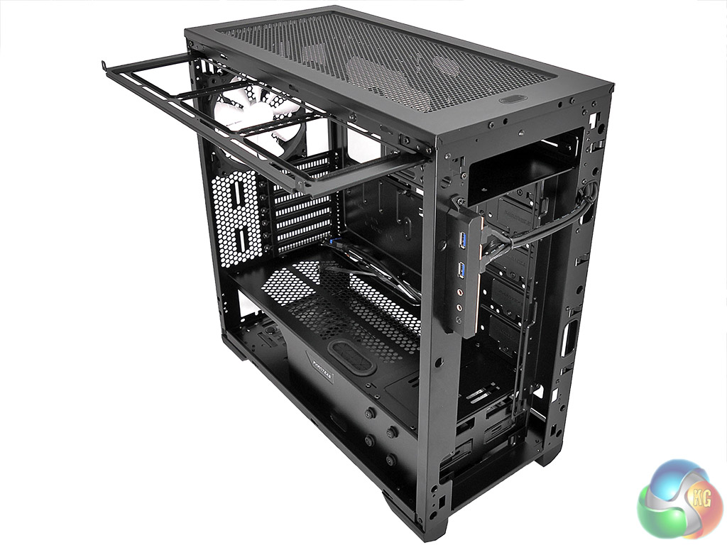 It is not immediately obvious that Pro M supports an E-ATX motherboard (as well as ATX/mATX/Mini-ITX), although you can expect to lose access to the cable management holes if you go down that route. In addition, you can easily slip a 240mm or 280mm liquid cooler in the front of the case and there is also a decent amount of room for cooling in the roof of the case. The sliding rack in the roof makes life considerably easier if you are installing fans or a radiator as you have full access to the mounting screws.