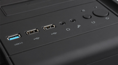 - Top I/O panel includes one USB3.0 port, two USB2.0 ports, and HD audio in/out jacks