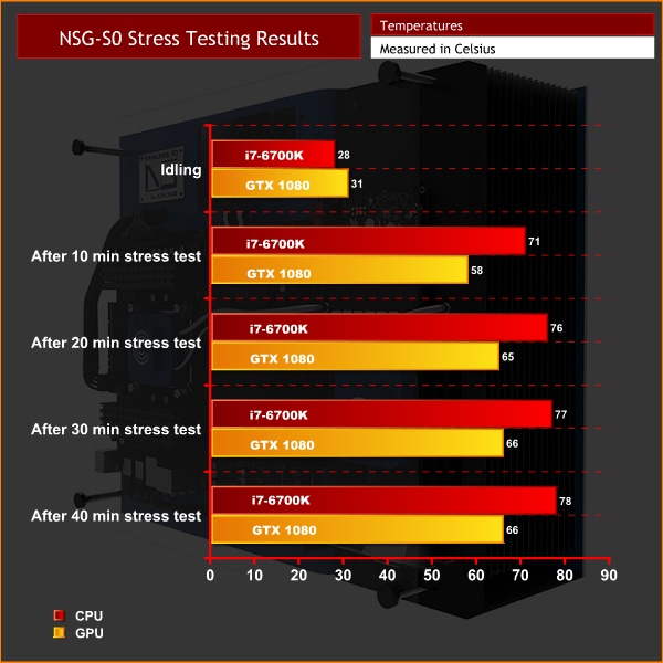 In-game, the NSG-S0 kept the i7-6700K and GTX 1060 very cool – this level of performance is approaching custom-loop territory, despite the fact that it is 100% silent.