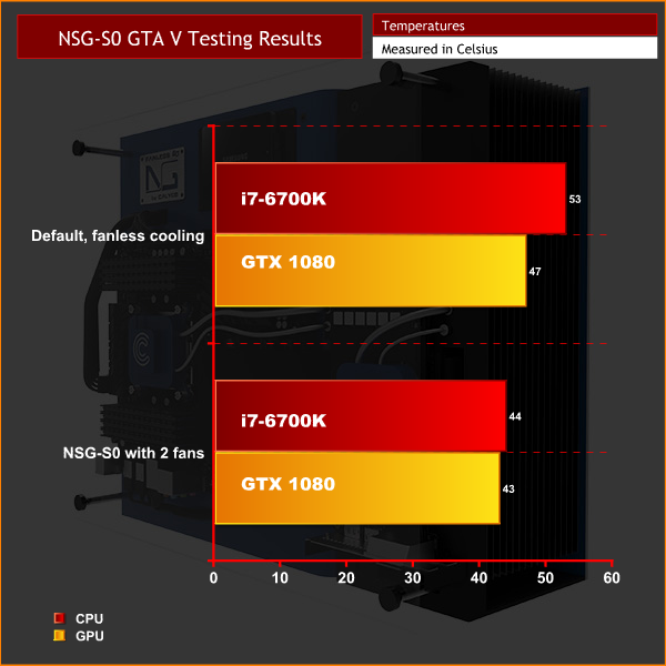 When we added in two fans – something Calyos wanted us to do simply to show the difference it makes – we saw a 9 degree drop in the CPU's temperature, and a 4 degree drop in the GPU's temperature.
