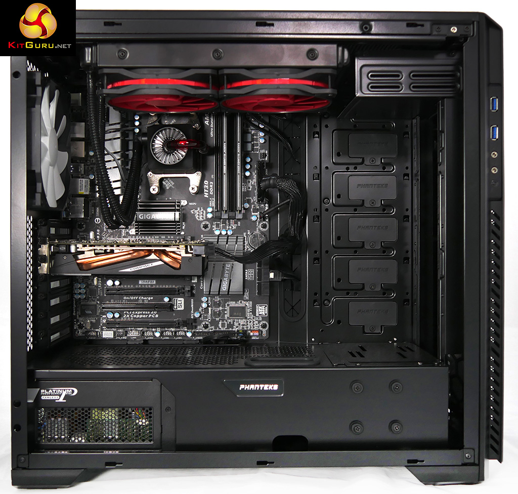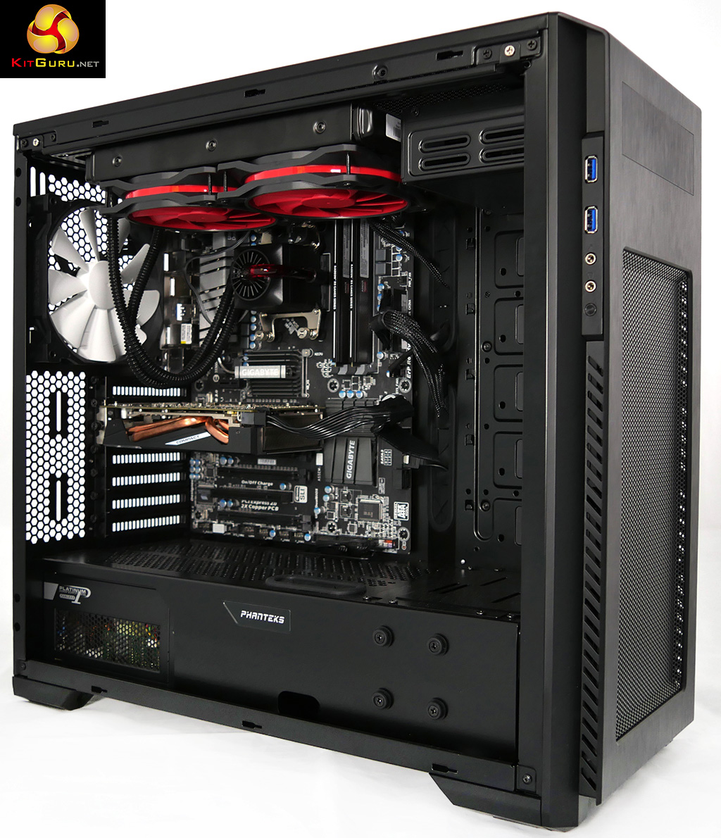 We used a Phanteks Enthoo Pro-M case and Seasonic 520W Platinum Fanless PSU as the basis of a test system. First we installed an Asus X79 Sabertooth motherboard with Intel Core i7-4820K CPU and G.Skill DDR3 and ran our tests and then we swapped to a Gigabyte 990FXA-UD3 motherboard with AMD FX-9590 CPU with AMD Radeon branded DDR3. This dual track approach gave us more reliable and repeatable results than the usual method of running a stock CPU and then overclocking to generate more heat.