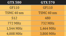 GTX570 runs the same number of cores as a GTX480, but it runs them 32MHz faster. It's 300MB lighter on memory and that GDDR5 has a 320-bit bus compared to the 384-bit monster data carrier found on the 580/480 cards.