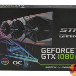 Packaging for the ASUS ROG STRIX GTX 1080 Ti OC is standard for an Nvidia card delivered by ASUS. Graphics of the card itself and some of the key features are shown on the front and rear sides of the box.