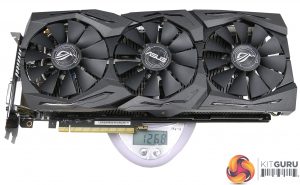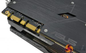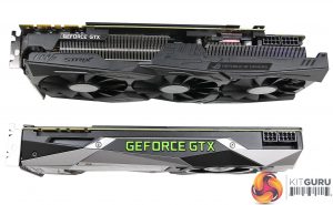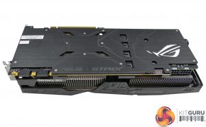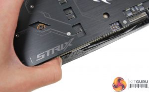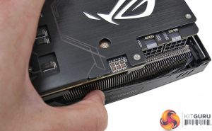 Weighing almost 1.3kg, this card is a perfect example for the uptake in strengthened PCIe x16 slots on modern motherboards. If you plan on shipping a system with this beast installed, I would advise caution. Thankfully, ASUS uses a custom PCB brace and a backplate which, combined with the mounting point for the heavy GPU cooler, should help to mitigate PCB sag.