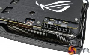 Juice is delivered via a pair of 8-pin PCIe power connectors (in addition to the PCIe slot), which provides additional headroom over the GTX 1080 Ti default 6-pin + 8-pin configuration. ASUS reverses the power connectors to make un-clipping the latches an easier task. They aren't recessed particularly far into the heatsink, either, which aids ease of installation and removal.