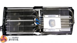 I am very pleased to see that ASUS has finally ditched the inefficient heatpipe direct touch design and has instead utilised a contact plate on top of the GPU. This is smart because the previous design meant that outer heatpipes on a five-pipe design were barely touching the GPU core. With this new ‘MaxContact‘ copper plate, thermal energy can be removed from the GPU before being released in a controllable manner to the six heatpipes. ASUS suggests that its precision machining step reduces surface roughness of the copper plate, allowing it to make better contact with the GPU core.