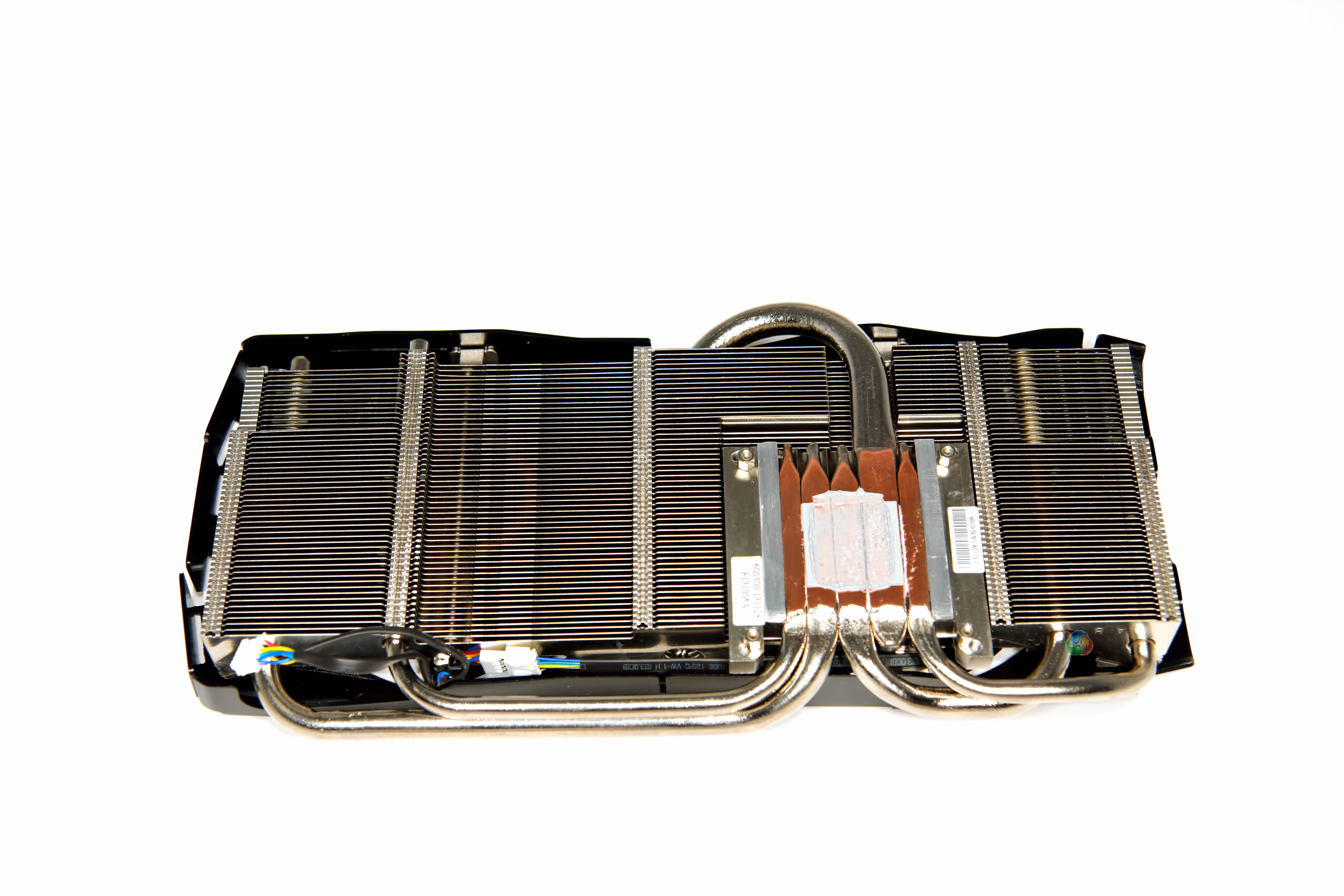 Interestingly, the Direct CU II cooler on this specific card is equipped with 5 direct touch heatpipes, 2 of which actually don't make direct contact with AMD's Hawaii core. We have heard from several sources that this cooler has been adopted from the ASUS GTX780 range, which would explain the core contact size differences. You can see this on page 2 of our review today.
