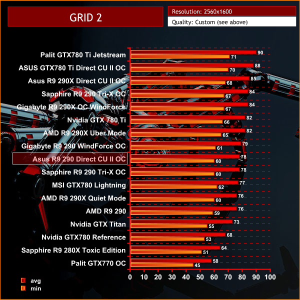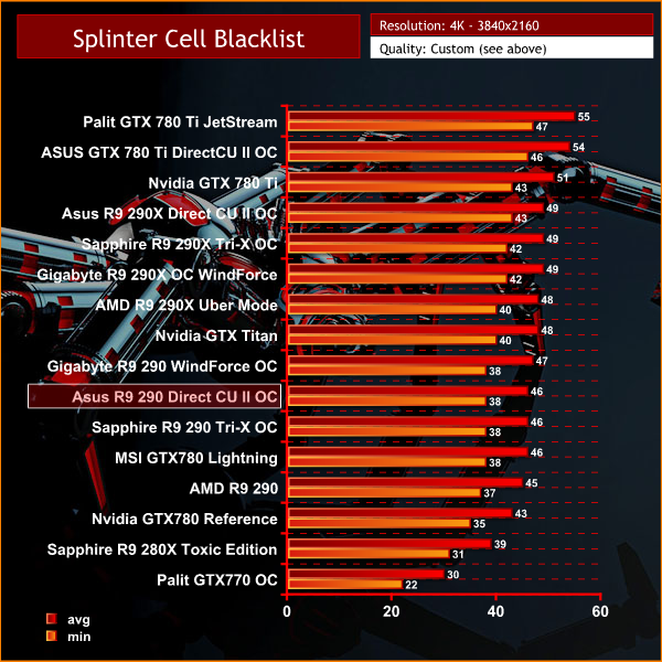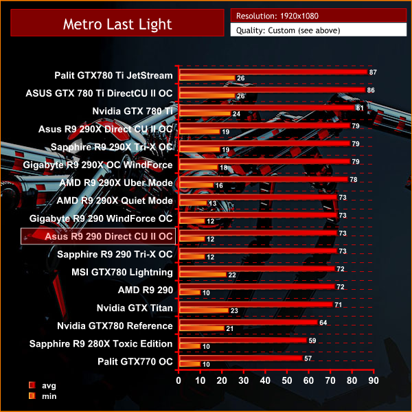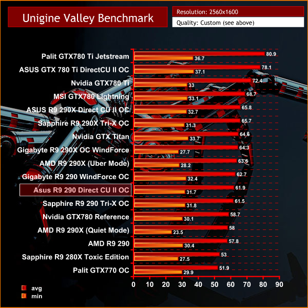 The Asus R9 290 Direct CU II OC scores well in this benchmark, averaging almost 62 frames per second.