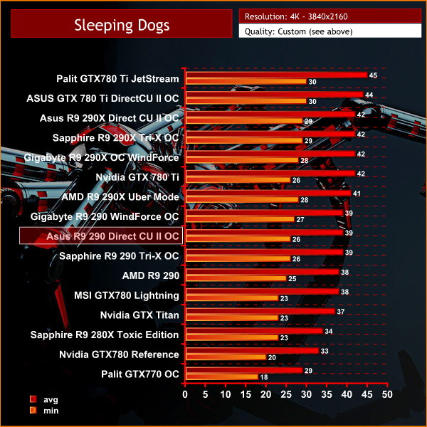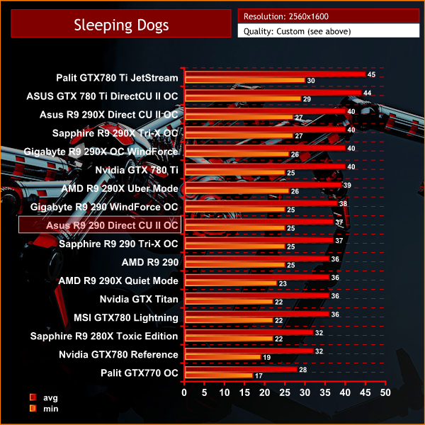 The Asus R9 290 Direct CU II OC holds a frame rate of 25 or greater at all times.Sleeping Dogs started development as an original title, but was announced in 2009 as True Crime: Hong Kong, the third installment and a reboot of the True Crime series.As a result of the game’s high development budget and delays, it was canceled by Activision Blizzard in 2011. Six months later, it was announced that Square Enix had picked up the publishing rights to the game, but the game was renamed Sleeping Dogs in 2012 since Square Enix did not purchase the True Crime name rights.