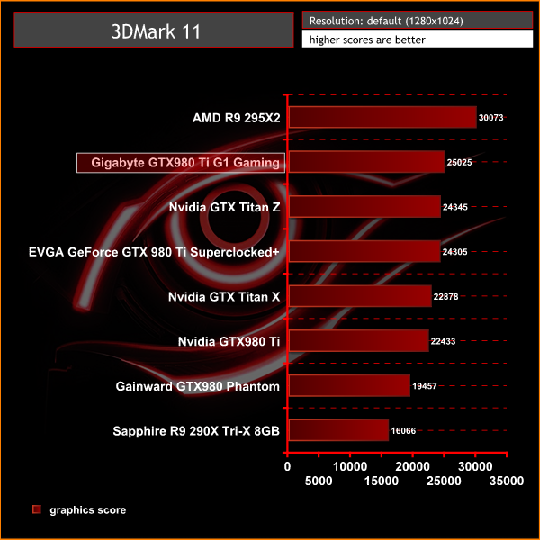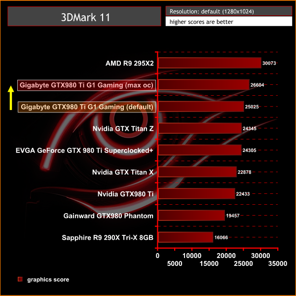 The Gigabyte GTX980 Ti G1 Gaming scores 25,025 points in the graphics test, placing it ahead of the low clocked Titan Z dual GPU card.