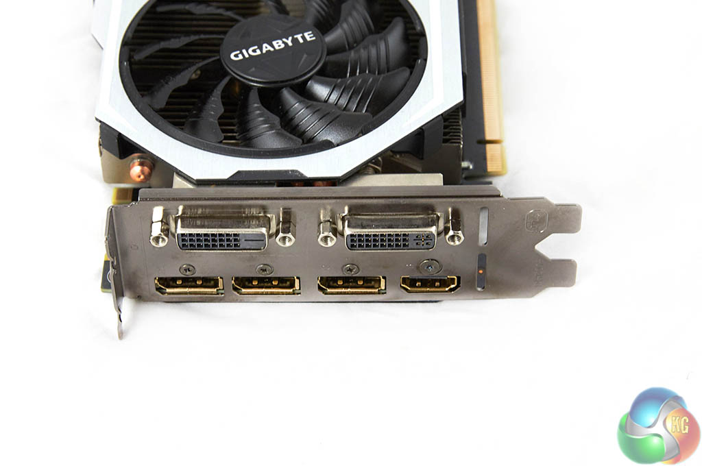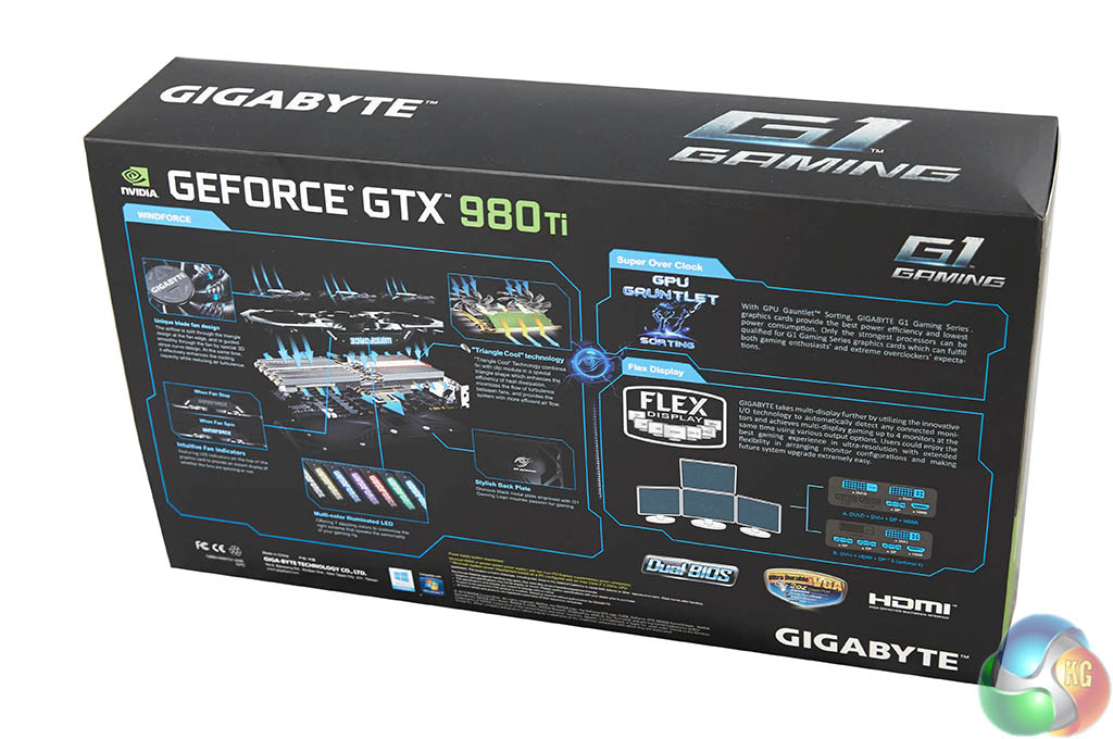 Unlike all the other GTX980 Ti's tested so far, the Gigabyte G1 Gaming ships with dual DVI ports (1x DVI-I and 1x DVI-D). Also there is a single HDMI 2.0 port (with HD audio and Blu-Ray 3D movie support), and three DisplayPorts. The move to predominately Displayport connectivity is inevitable and welcomed. If you wish, you can use all these ports at the same time for triple monitor gaming.