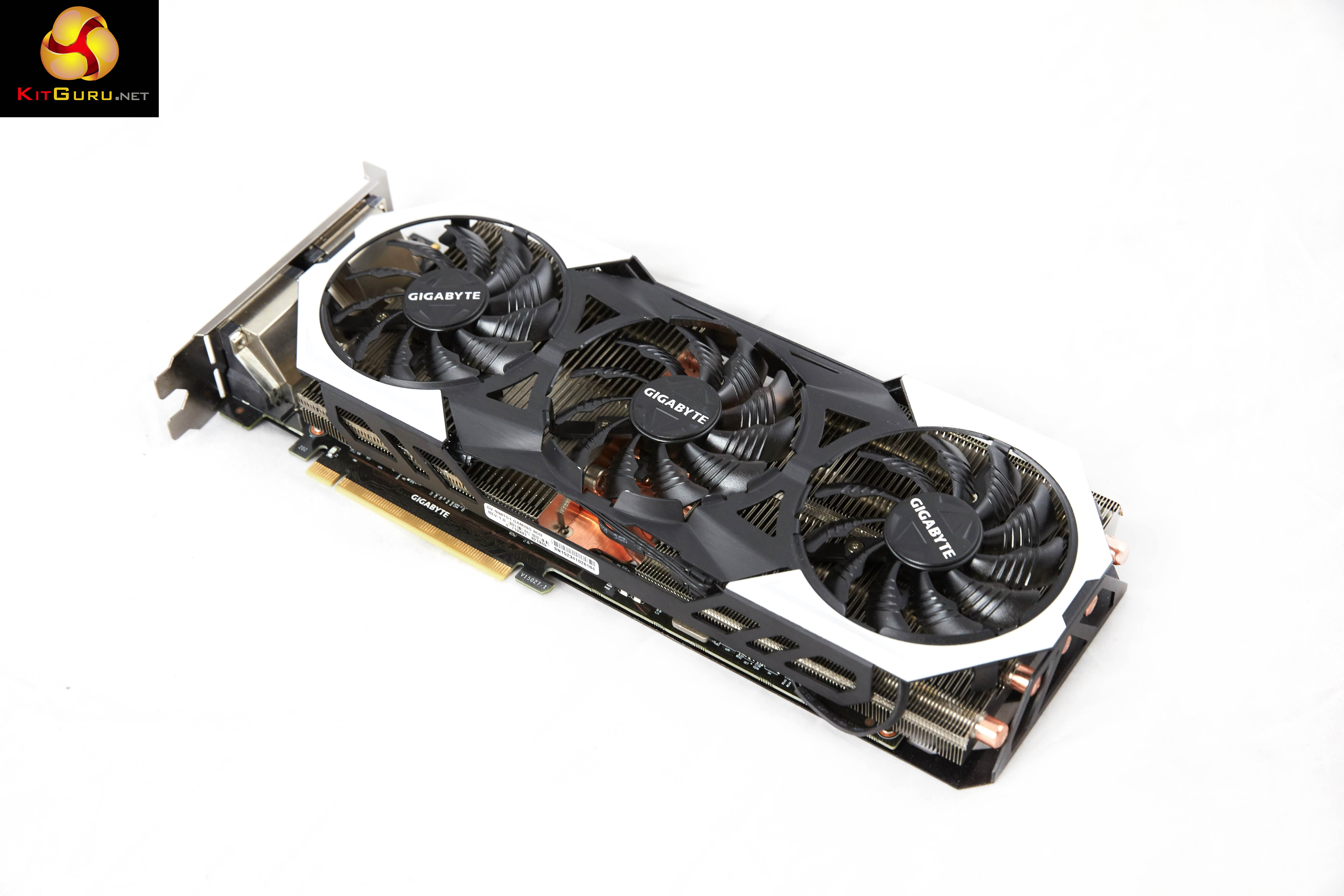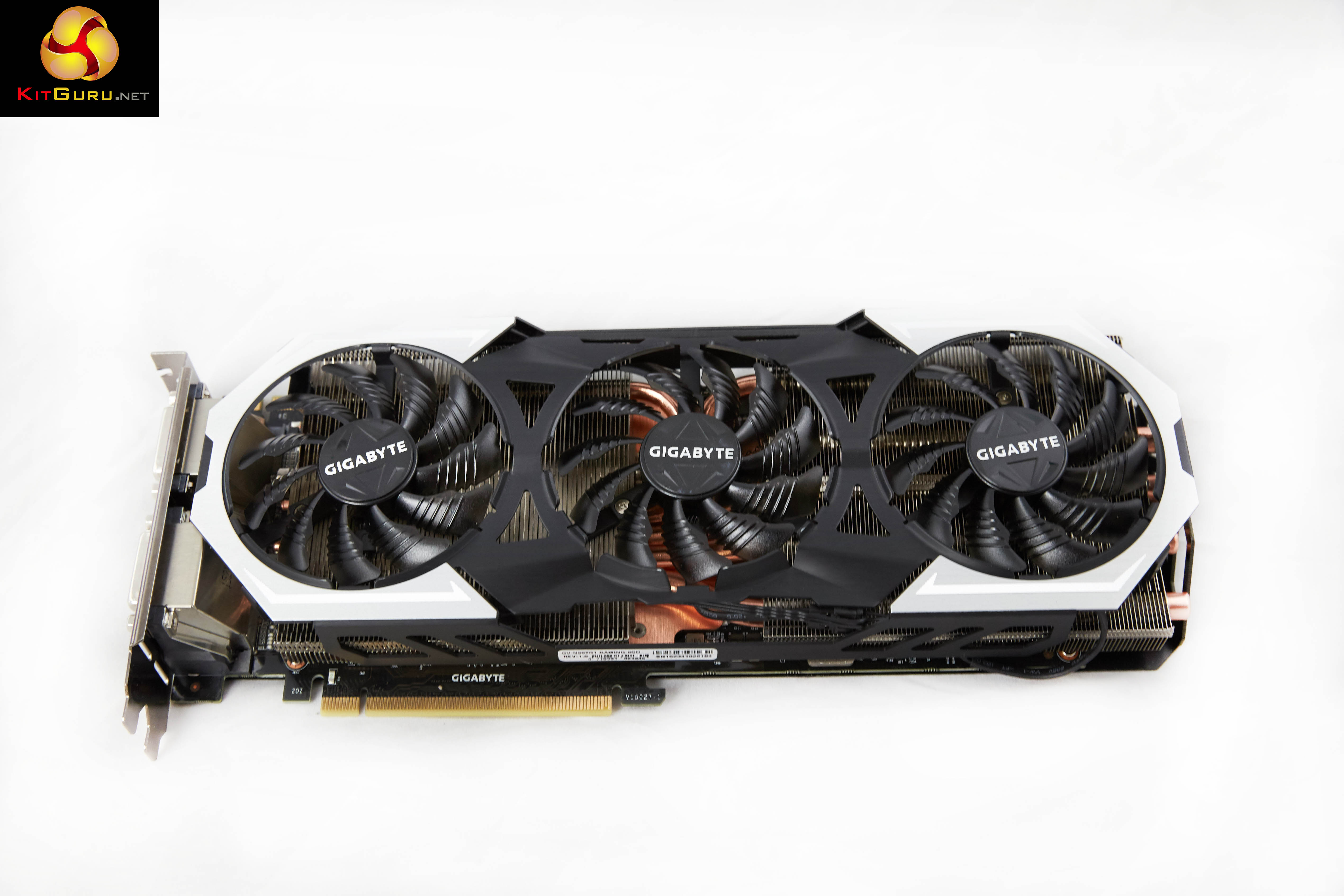 An overview of the hardware in the latest version of GPUz – as discussed on the previous page. This overclocked GM200 core runs at 1,152mhz (1,241mhz boost) and is built on the 28nm process. The GTX980 Ti has 96 ROPs, 176 Texture units (Titan X has 192 texture units) and 2,816 CUDA Cores (Titan X has 3,072 CUDA Cores). The 6GB of GDDR5 memory runs at 1753mhz (7Gbps effective) and is connected via a 384 bit memory interface. Gigabyte have not overclocked the GDDR5 memory, which is a little surprising.On this page we present some high resolution images of the product taken with a Canon 1DX and Canon 28-70mm F2.8 lens. These will take much longer to open due to the dimensions, especially on slower connections. If you use these pictures on another site or publication, please credit Kitguru.net as the owner/source.