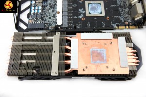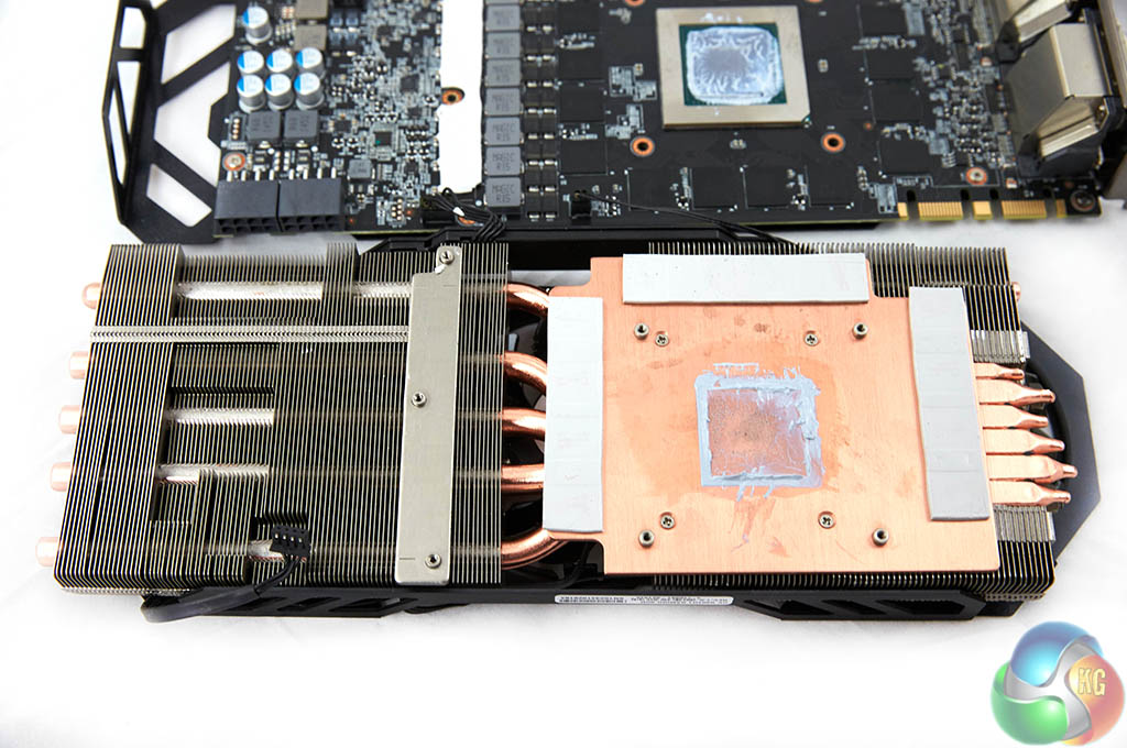 The cooler is very substantial indeed. There are a total of 6 copper pipes that run into the base. Five of them (8mm) run parallel to the PCB, and one (6mm) bends around to run in the opposite direction, into a smaller, separate aluminum heatsink. The copper heatsink also directly cools the GDDR5 memory chips on the PCB.