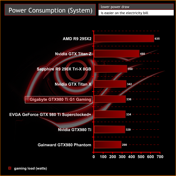 Maxwell cards are always extremely power efficient. As we can see the GTX980Ti system consumes 329 watts under gaming load and the EVGA overclocked card takes around 7 watts more.We use MSI's Afterburner to overclock the EVGA GeForce GTX 980 Ti Superclocked+ ACX 2.0+.