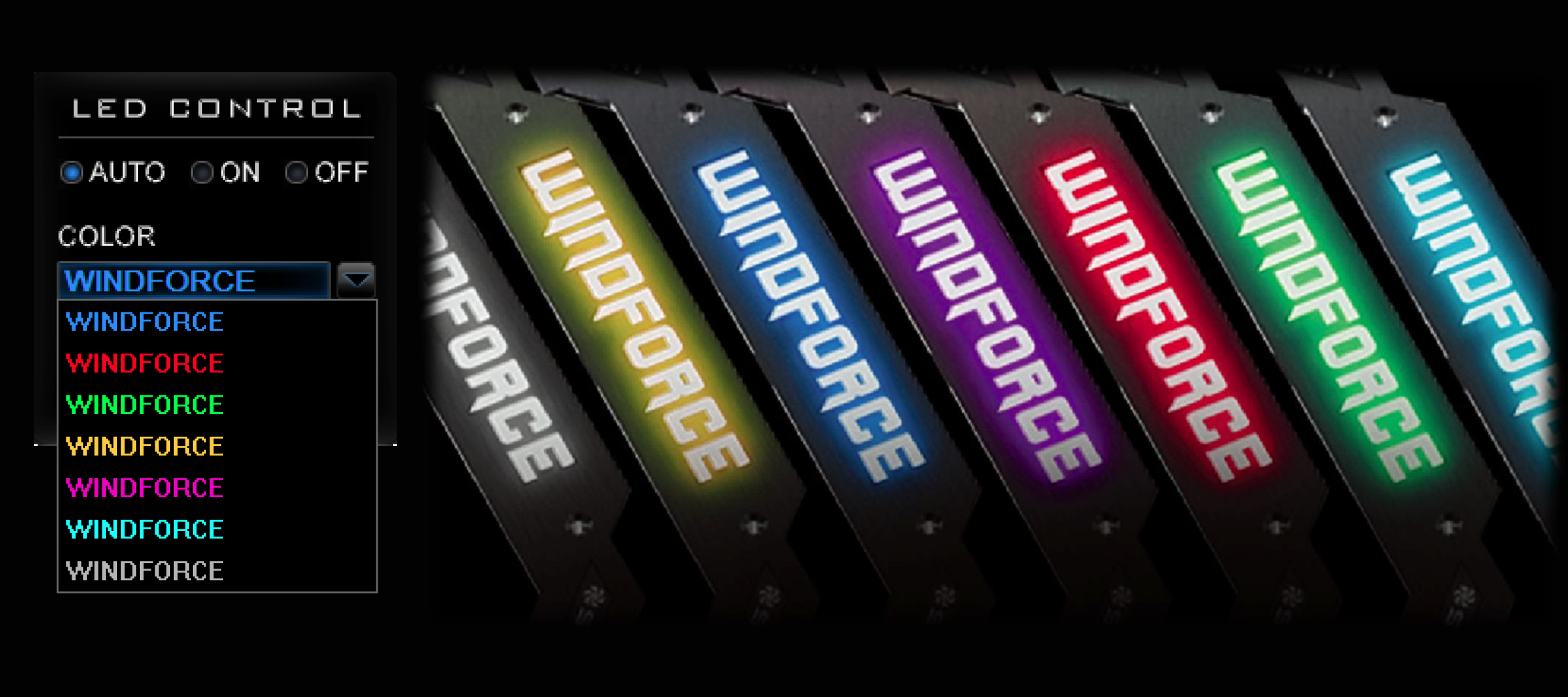 The ‘WINDFORCE' branding on the side of the cooler lights up when the card is in operation. The end user can change the colour of this backlighting via the Gigabyte OC GURU II software. This will be popular for those who like to colour coordinate system components. A total of 7 colours are offered.