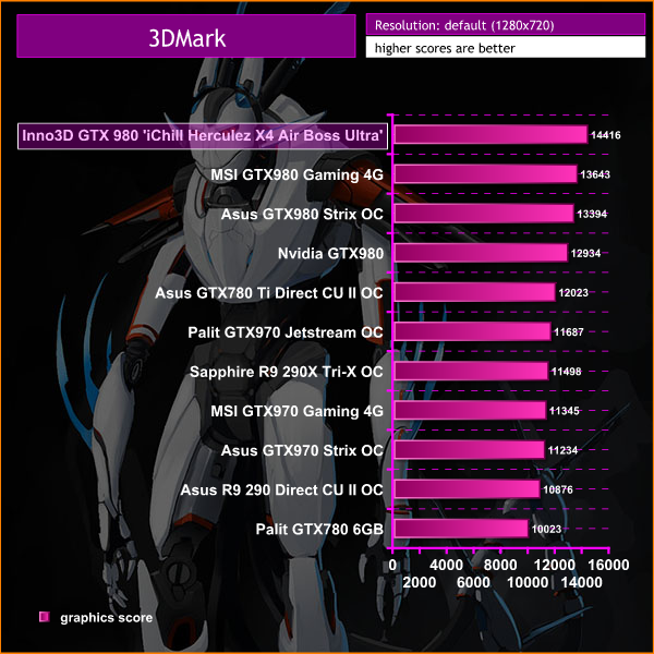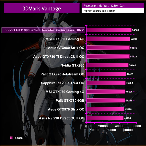 The Inno3D GTX 980 ‘iChill Herculez X4 Air Boss Ultra' scores exceptionally well in this older Direct X 10 benchmark, scoring 54,063 points.
