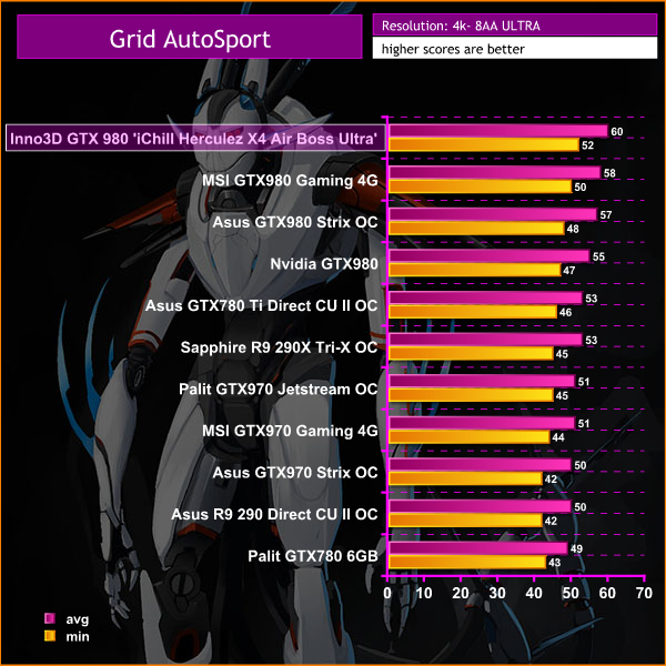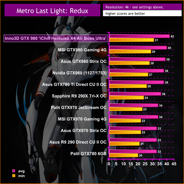 At 4K Inno3D GTX 980 ‘iChill Herculez X4 Air Boss Ultra' is one of the few cards that can hold a minimum frame rate above 25 at all times.