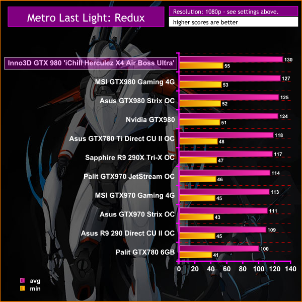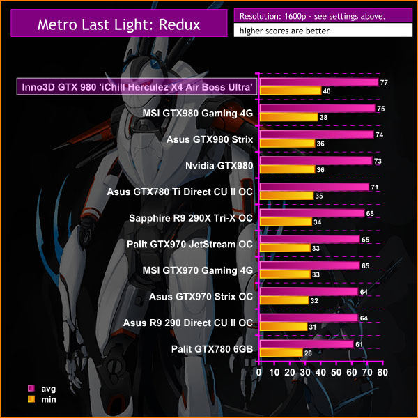 On May 22, 2014, a Redux version of Metro Last Light was announced. It was released on August 26, 2014 in North America and August 29, 2014 in Europe for the PC, PlayStation 4 and Xbox One. Redux adds all the DLC and graphical improvements. A compilation package, titled Metro Redux, was released at the same time which includes Last Light and 2033. (Wikipedia). We test with following settings: Quality-Very High, SSAA-off, Texture Filtering-16x, Motion Blur-Normal, Tessellation-Normal, Advanced Physx-On.