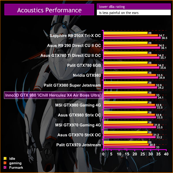 Not the quietest GTX980 cooler we have tested, but the results, considering the cooling performance are stellar.
