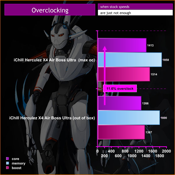 We were able to push the core to 1,413mhz – translating into a 11.6% clock increase. The Boost speed was running at 1,514mhz.
