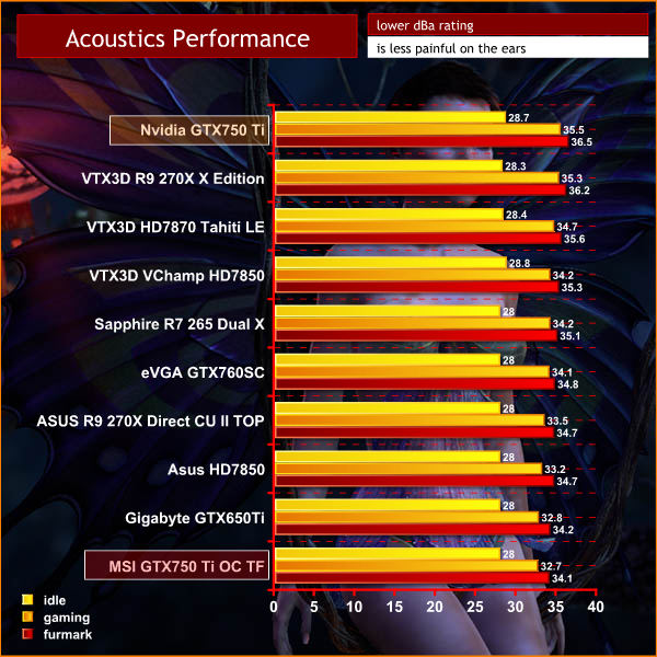 The MSI GTX 750 TI OC is an extremely quiet running card, breaking new records in our testing, and the maximum thermal reading of 49c when gaming is one of the best results we have ever seen in our labs. For those people building a system in a new, space restricted HTPC chassis, power demand, noise and heat output are critical areas to take into consideration.