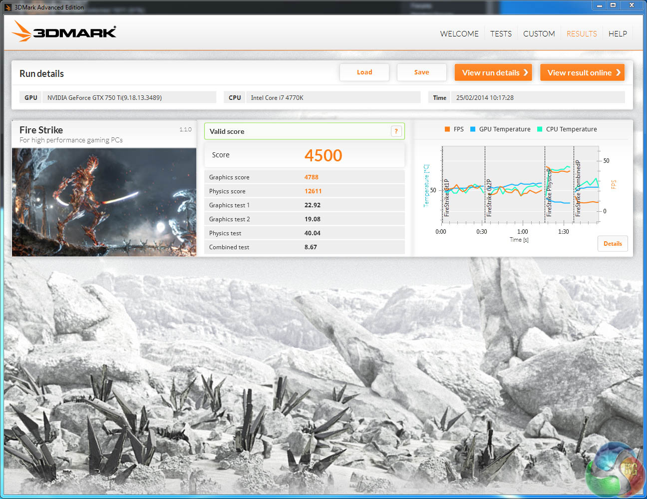 The latest version of Futuremark's 3DMark shows the Palit GTX750 Ti StormX Dual scoring just behind the Sapphire R7 265 Dual X solution at 4,788 points.