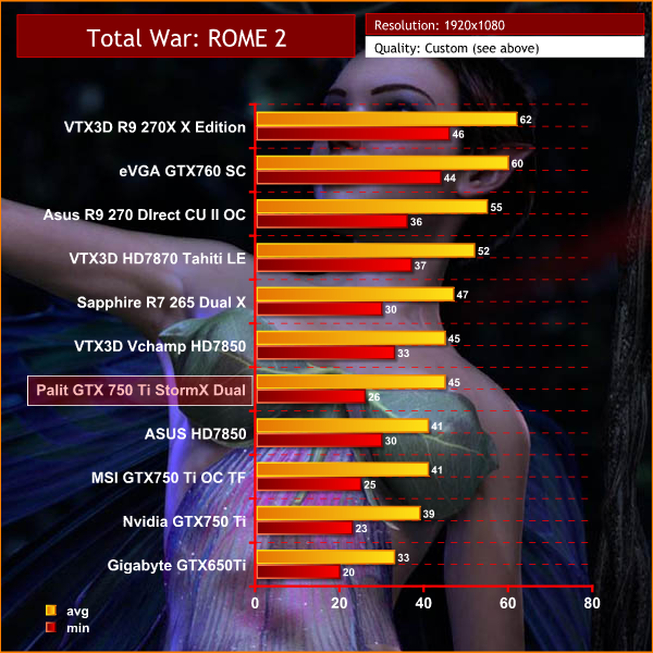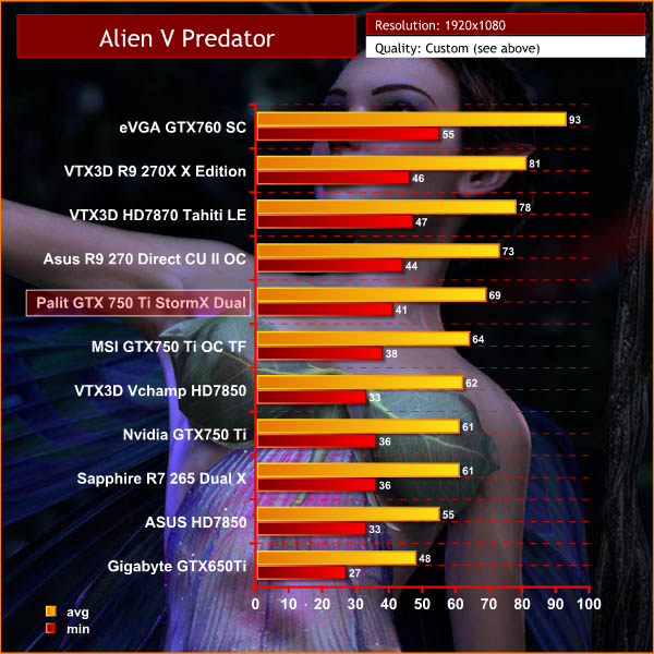 The Palit GTX 750 Ti StormX Dual may not achieve the same average frame rates as the Asus HD7850, however the minimum frame rate is slightly better, which means it plays a little smoother overall.