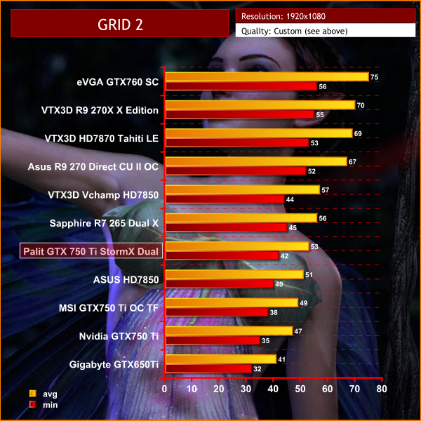 GRID 2 is perfectly playable on the Palit GTX 750 Ti StormX Dual, even at these high settings, averaging 53 frames per second. Performance is only a couple of frames behind the Sapphire R7 265 Dual X.