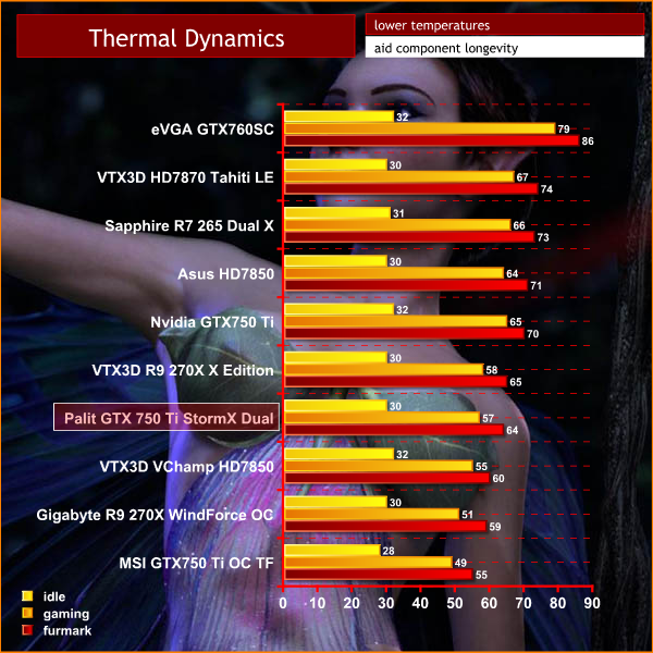 The we noted earlier in the review, the cooler isn't as impressive as the Twin Frozr fitted to the MSI GTX 750 Ti. This directly translates into a noticeable temperature difference between the cards. The MSI solution runs at 49c under load when gaming, and the Palit card 57c. Still, these are impressive results.
