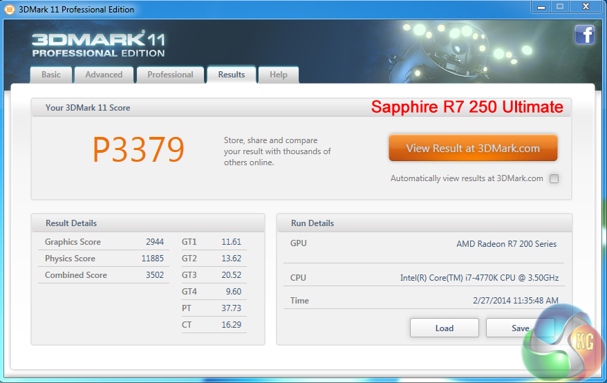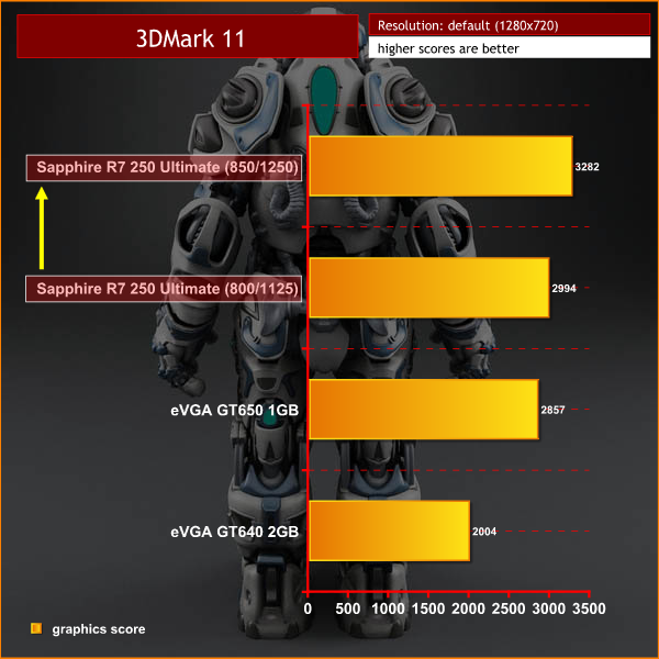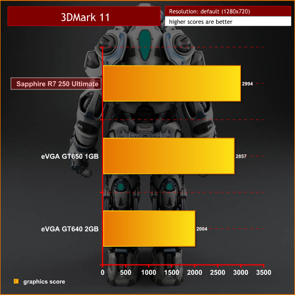 The Sapphire R7 250 Ultimate trades places with the eVGA GT650 1GB at the top of the chart, scoring just under 3,000 points in the graphics section of the 3DMark 11 test.