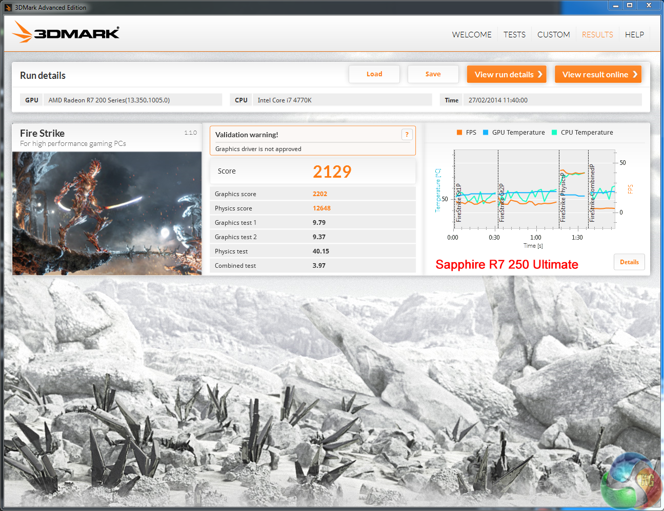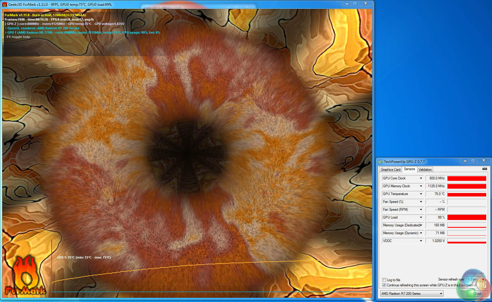 As the Sapphire R7 250 Ultimate is a fan-less solution, we had to stress the card for a long time to see how the cooler handled with continued heat from the core. It peaked at 67c when gaming, and 75C when under Furmark load. These are good results.