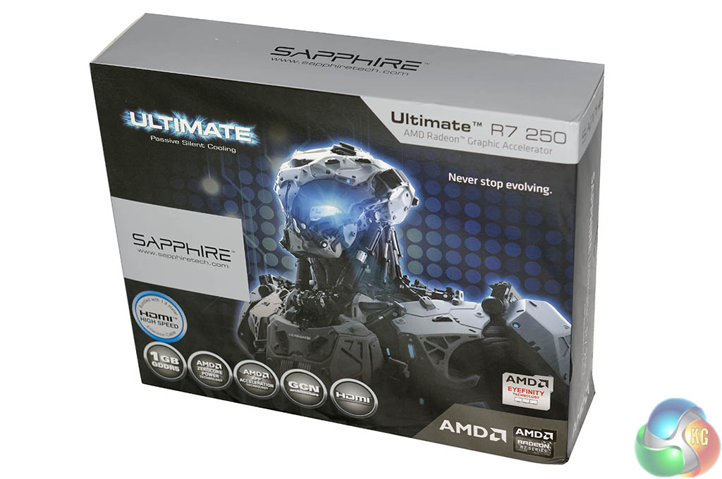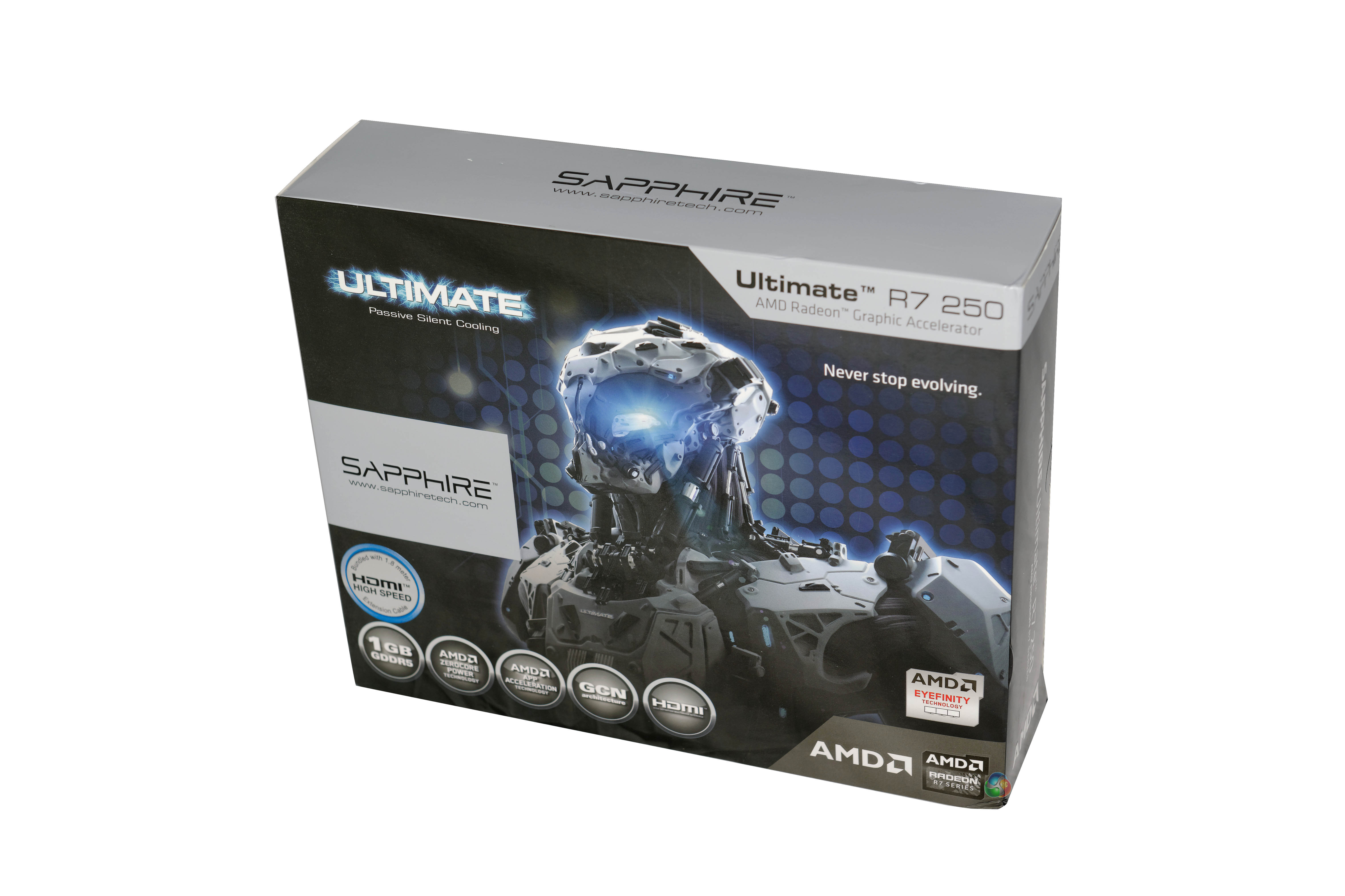 The Sapphire R7 250 ships in a small box. Sapphire recently ditched their 3D rendered women for 3D rendered robots. Good call we say.