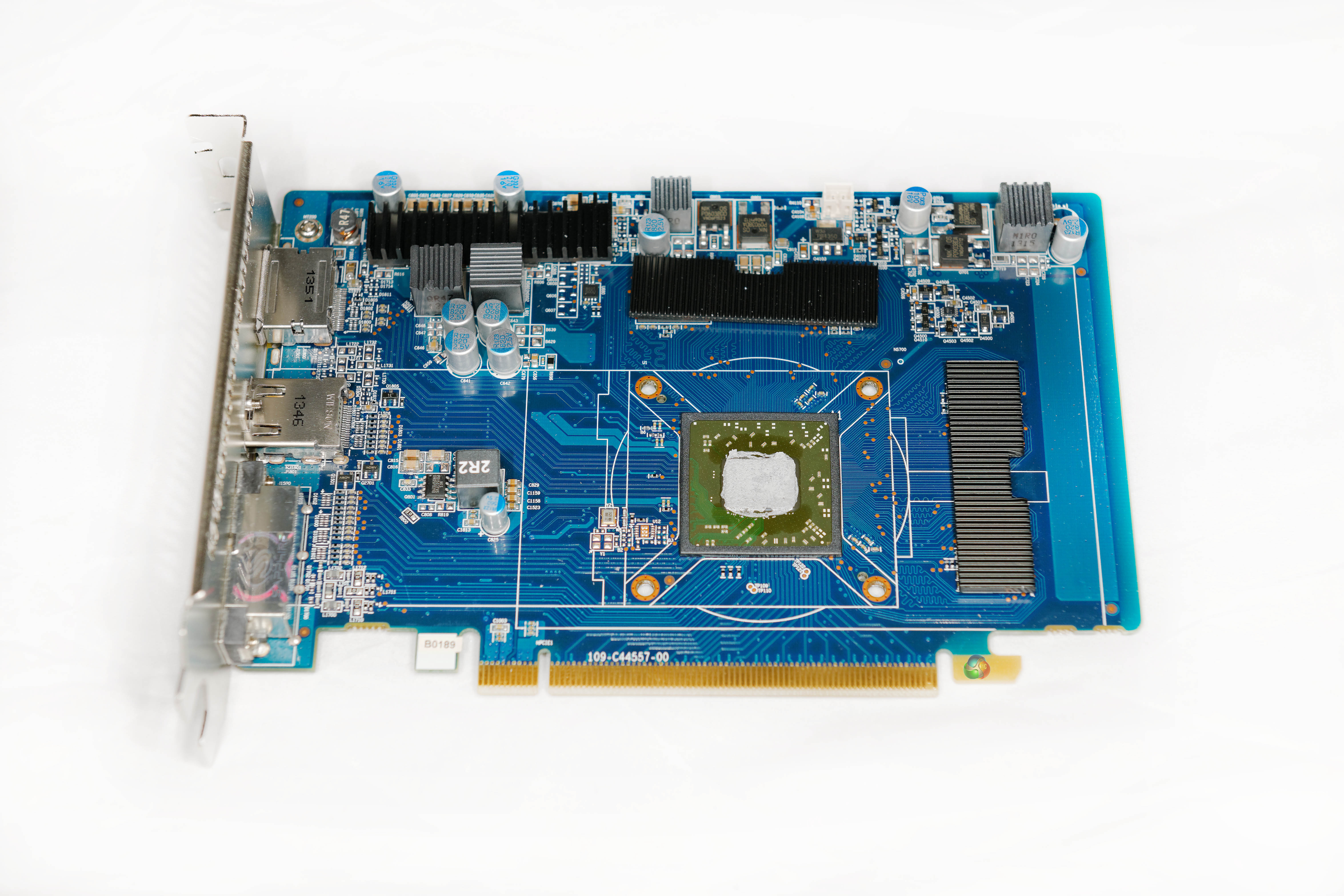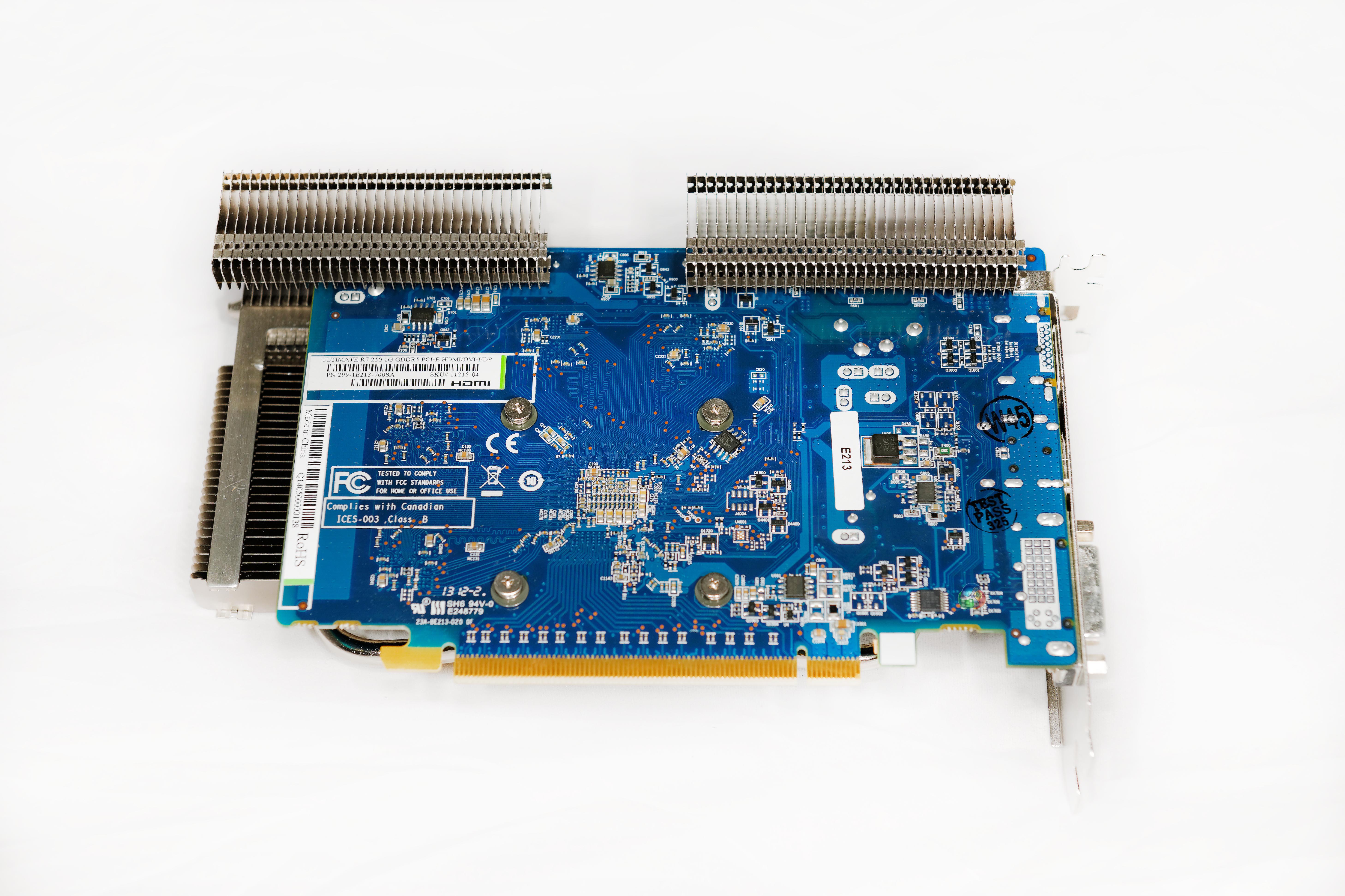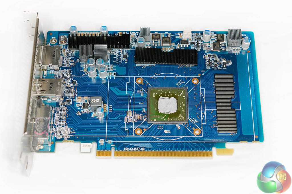 As this is a passively cooled card, there are no fans fitted to the cooler. Instead the PCB is almost completely covered from the front with a giant aluminum heatsink. The rear view of the card shows a blue PCB, with two large cooling blocks which ‘wrap around'.