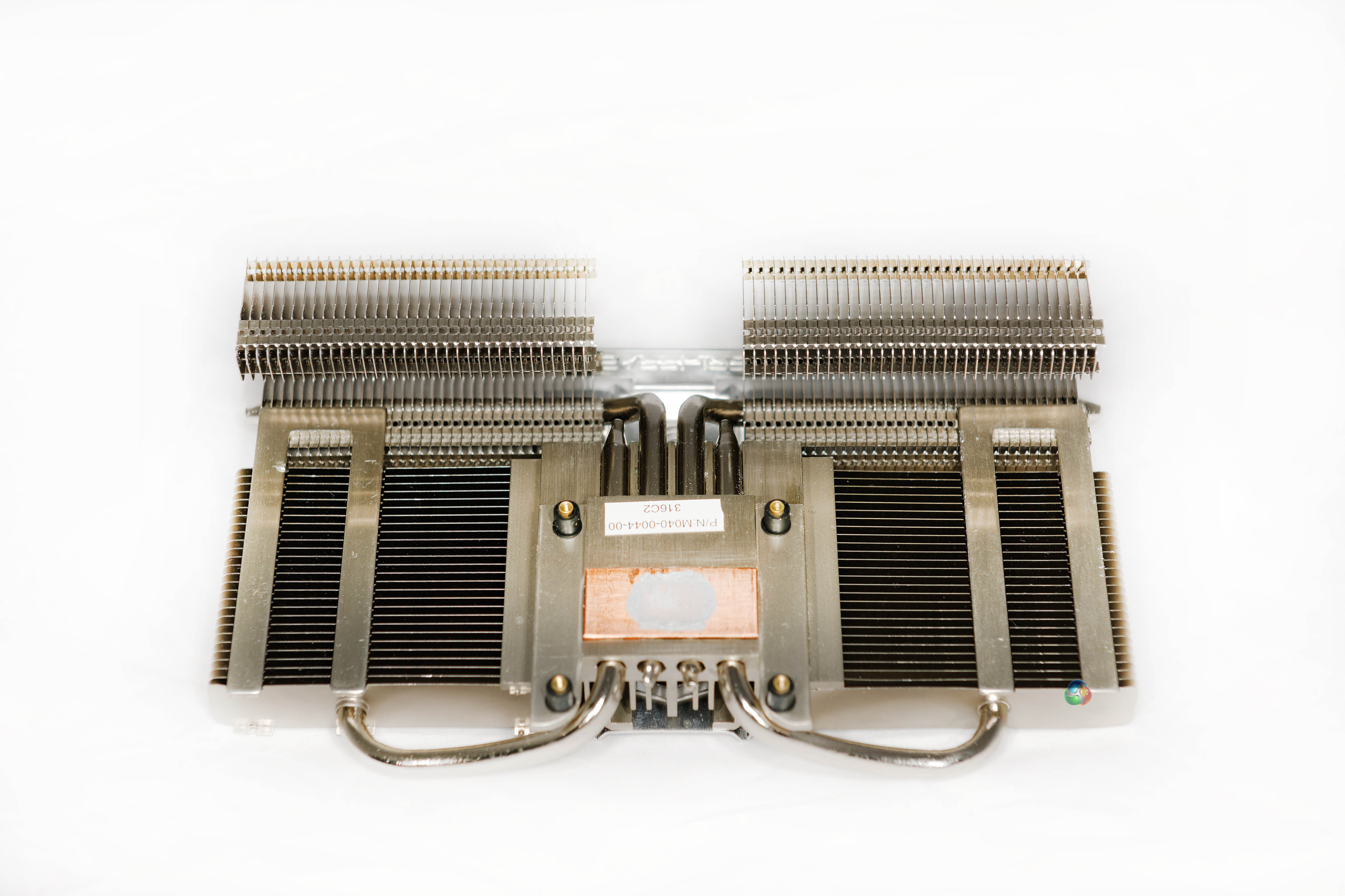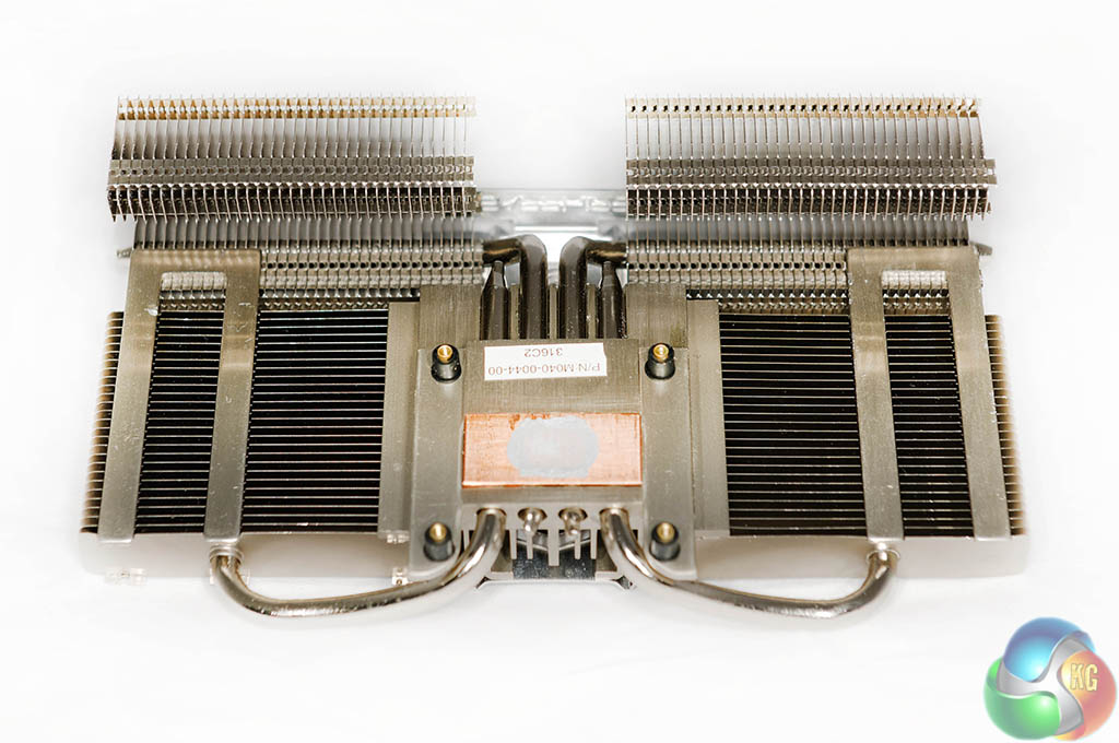 The heatsink is held in place with the four main mounting screws and slips out from one side of the PCB. It may look like there are only two racks of aluminum fins on either side of the core, but there are actually four. Each heatpipe runs into a single heatsink from both sides of the design. The GDDR5 memory chips are cooled by heatsinks which are attached from above. The VRM's are also cooled by a heatsink.