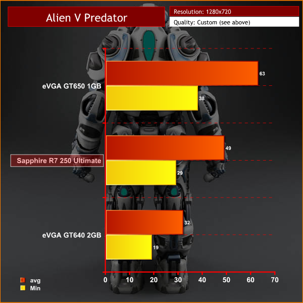 The GT640 is seriously underpowered, struggling to average smooth frame rates. The GT650 however is much better, averaging 51 frames per second. The Sapphire R7 250 Ultimate is closely matched, but loses out a little in a direct head to head.
