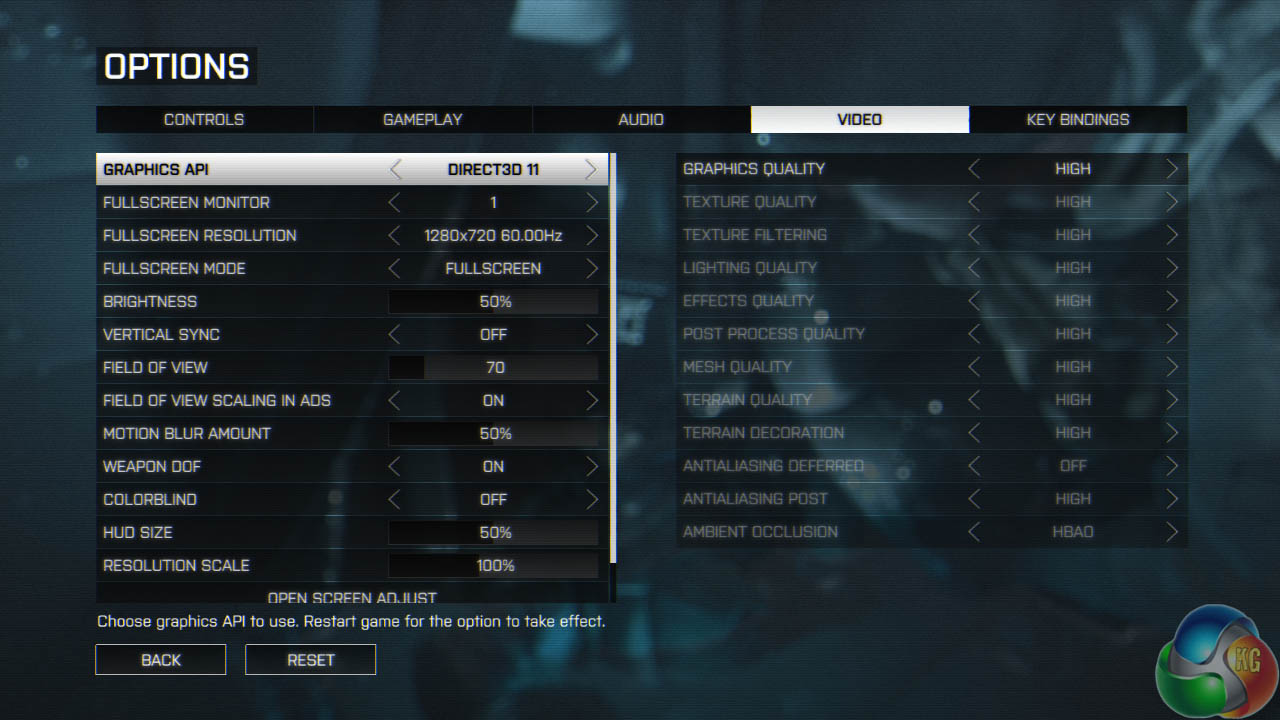 We selected 1280×720, with 8MSAA and the ULTRA profile.