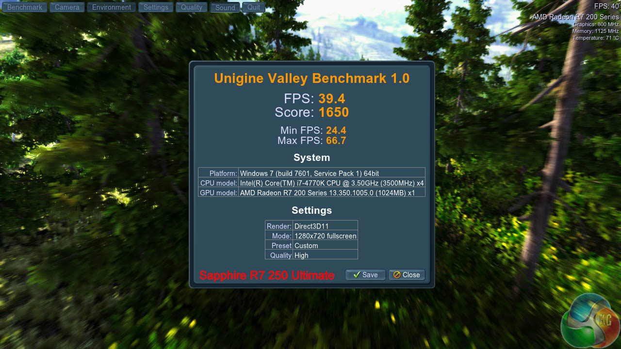 The same performance positions as we recorded on the previous Unigine Heaven test page. the GT650 1GB claims top spot easily, with the Sapphire R7 250 Ultimate slotting into the middle.