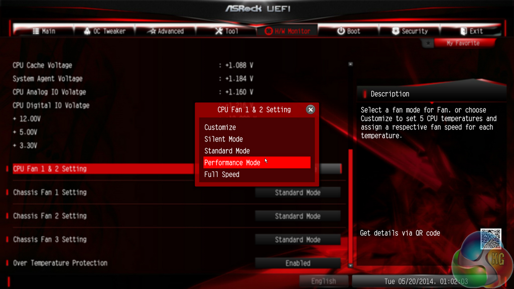 ASRock includes a balanced set of voltage, temperature, and fan speed readings on its HWMonitor page. Operation of the CPU and chassis fans can be set to pre-defined configurations via the BIOS, or a user can create their own profile.