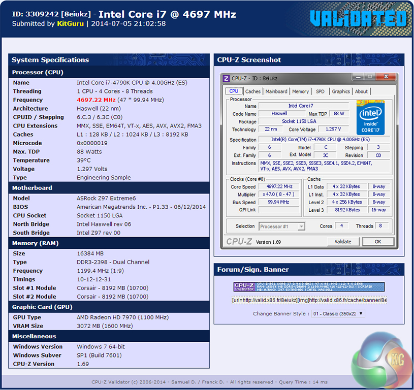 We will outline the performance increases that can be obtained from using the ASRock Z97 Extreme6 motherboard to overclock our system. Our overclocked processor frequency was 4.7GHz and memory speed was 2400MHz.
