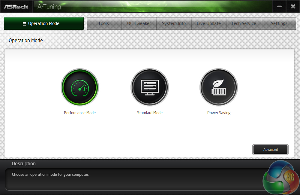 ASRock's A-Tuning software gives users access to their system's operating state and a number of convenient tools. Performance, Standard, or Power Saving modes can be applied via F-Stream. We noticed that the Standard mode would result in slightly decreased benchmark results compared to the Performance option.