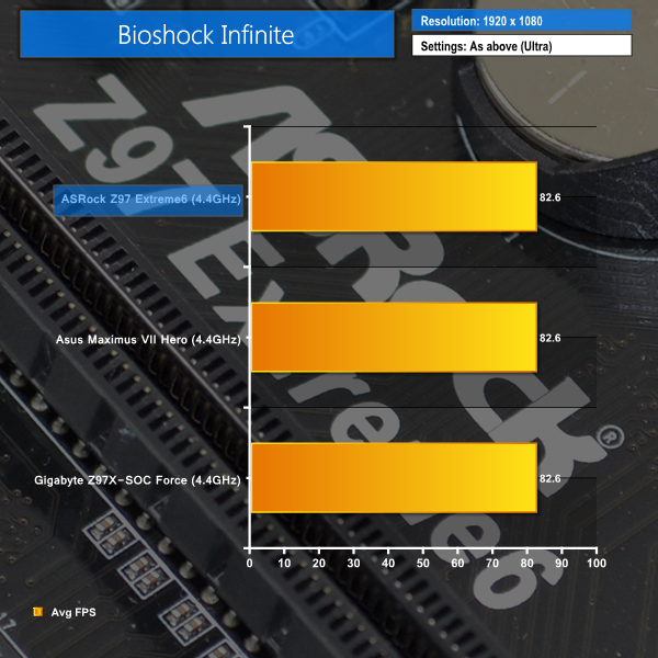 Gaming performance is almost identical between each Z97 board. ASRock's part does manage to muster up a couple of extra slithers of a frame in the Tomb Raider benchmark, although the results are almost close enough to declare a common tie.
