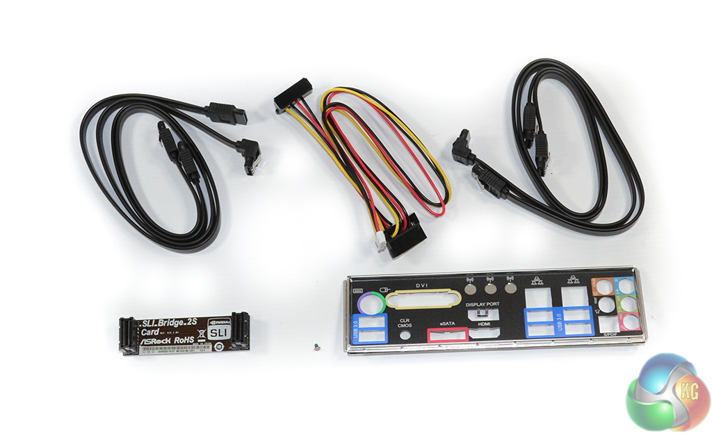 ASRock provides a fairly healthy bundle which consists of four SATA cables, an SLI bridge, the rear IO shield, and the HDD Saver connector.
