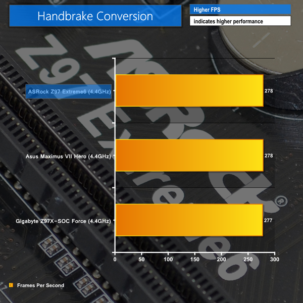 ASRock's motherboard continues its positive performance in CPU-heavy benchmarks. The Z97 Extreme6 is as fast as the other motherboards that we have tested with our 4790K processor.