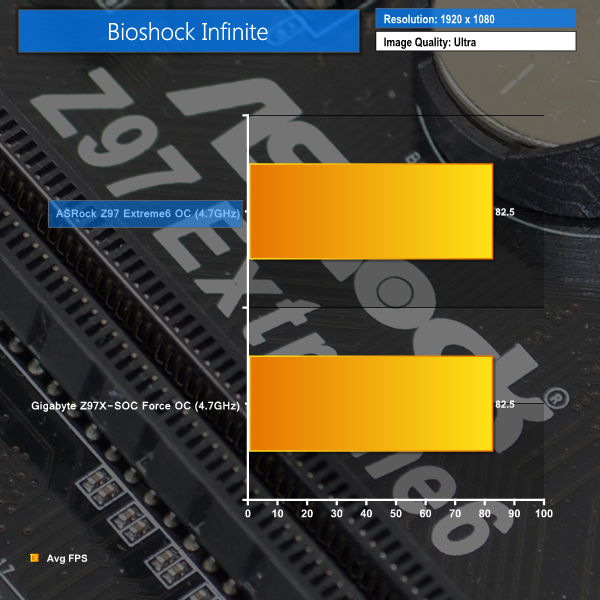Using the Z97 Extreme6 to overclock our 4790K can deliver noticeable improvements in performance. Gigabyte's Z97X-SOC Force is slightly faster in Cinebench and 3DMark, while Bioshock Infinite results in a tie.