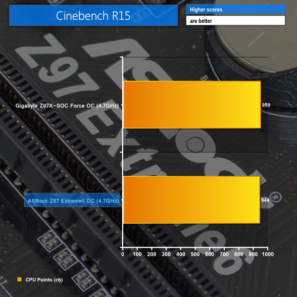 As a performance comparison, we have included the overclocked results from Gigabyte's Z97X-SOC Force motherboard. The maximum overclocked configuration achieved with both boards was a 4700MHz (47 x 100MHz) processor frequency and 2400MHz CL10 memory speed.