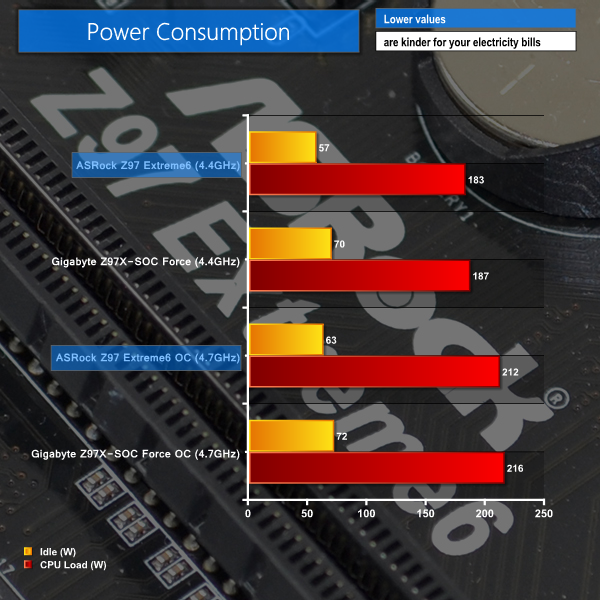 Power consumption of ASRock's controller-heavy Z97 Extreme6 is slightly lower than that of Gigabyte's overclocking-orientated Z97X-SOC Force. ASRock's twelve phase Super Alloy power delivery system seems to be an efficient one.