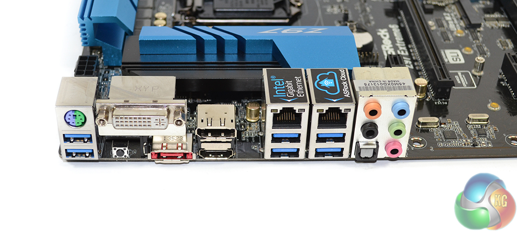 DVI (which carries both digital and analogue VGA signals), HDMI, and DisplayPort connections provide video. In close proximity to the video connections are an eSATA 6Gbps connector powered by the ASM1061 controller and a clear CMOS button.