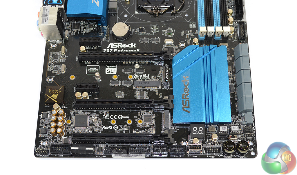Two M.2 connectors provide Z97 Extreme6 users with plenty of on-board storage options. An M.2 SSD could be installed in the Z97-fed lower M.2 slot, while a higher-speed drive could operate from the 32Gbps Ultra M.2 connection.