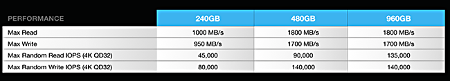 OCZ list the specifications of the 480GB and 960GB units as very closely matched, hitting peaks of 1,800MB/s read and 1,700 MB/s write. IOPS performance is also closely matched with random write IOPS performance rated at 140,000. That said, the 960GB unit has a higher rated 4K QD32 rated random read rating of 135,000 (versus 90,000). The smaller 240GB unit is significantly slower than either the 480GB or 960GB drive, hitting a maximum read speed of 1000MB/s and maximum write speed of 950 MB/s. Still, hardly slow.