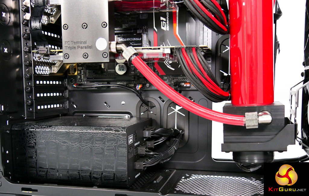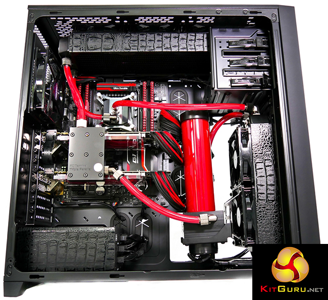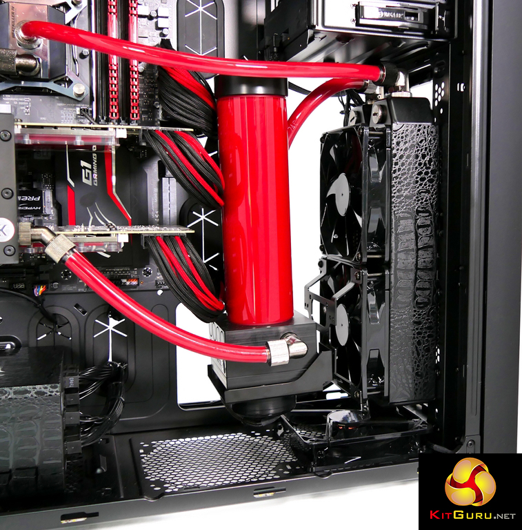 The only questionable aspect of the cooling system is the way the pump/reservoir is mounted on a bracket that is attached to one of the fans on the front radiator. It's a set-up that hangs a fair amount of weight from the bracket without a secondary support and the result is a reservoir that isn't quite vertical. It is a minor point but nonetheless it is annoying as the system is effective and looks really good in every other respect.